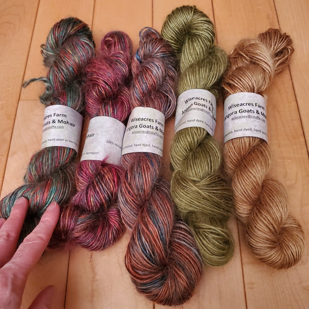 The new yarn (first on the left) joins its siblings! I think another honey-brown solid might be next; that’s just the batch that came out best this year.