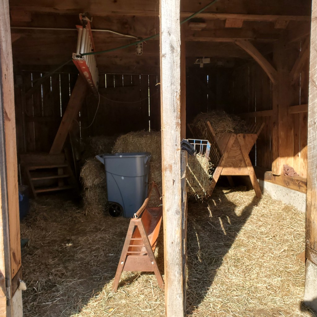 This barn was full of 184 bales of hay; they were all transported from the wagon into the barn, and then from the barn up into the hayloft, by the two of us, this weekend.