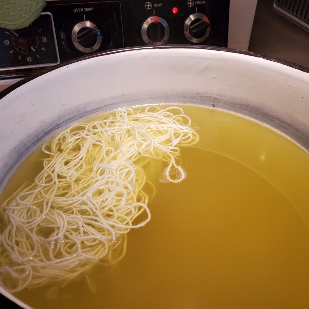 And today sees me doing my first attempt at cotton dyeing. My first fail was turning the stove on. I didn’t recall where in the directions they said to turn on the heat, but figured it must have been SOMEWHERE… no, apparently not, according to iLiveToDye. I am not sure if that ruined anything chemically. But this spaghetti has been sitting in the dyepot for hours now and is still white. (Not actually spaghetti.)