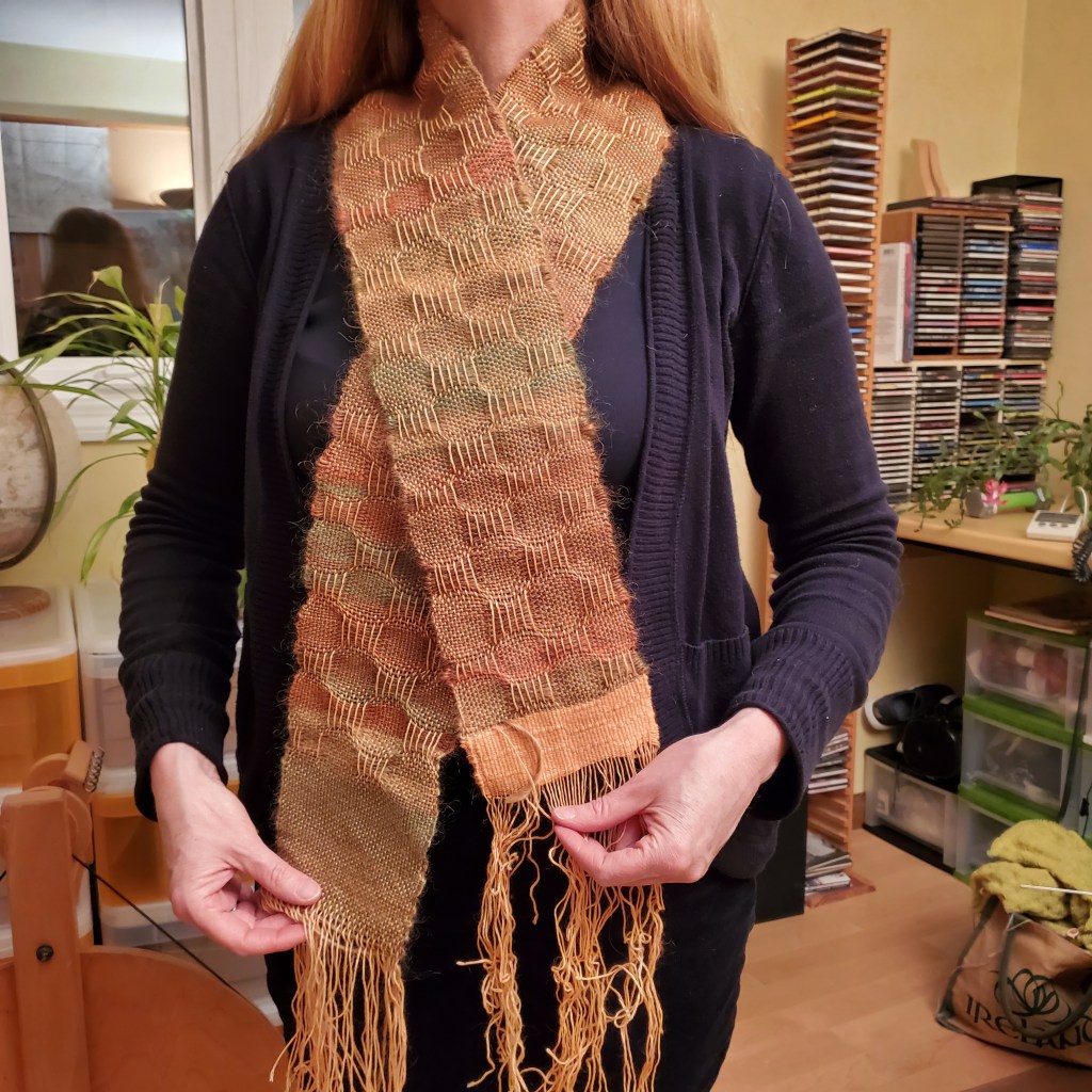 I just took this off the loom (hence all the threads hanging off it and messy borders). It’s not a scarf – it’s too short and not comfortable. I’m just modeling it.