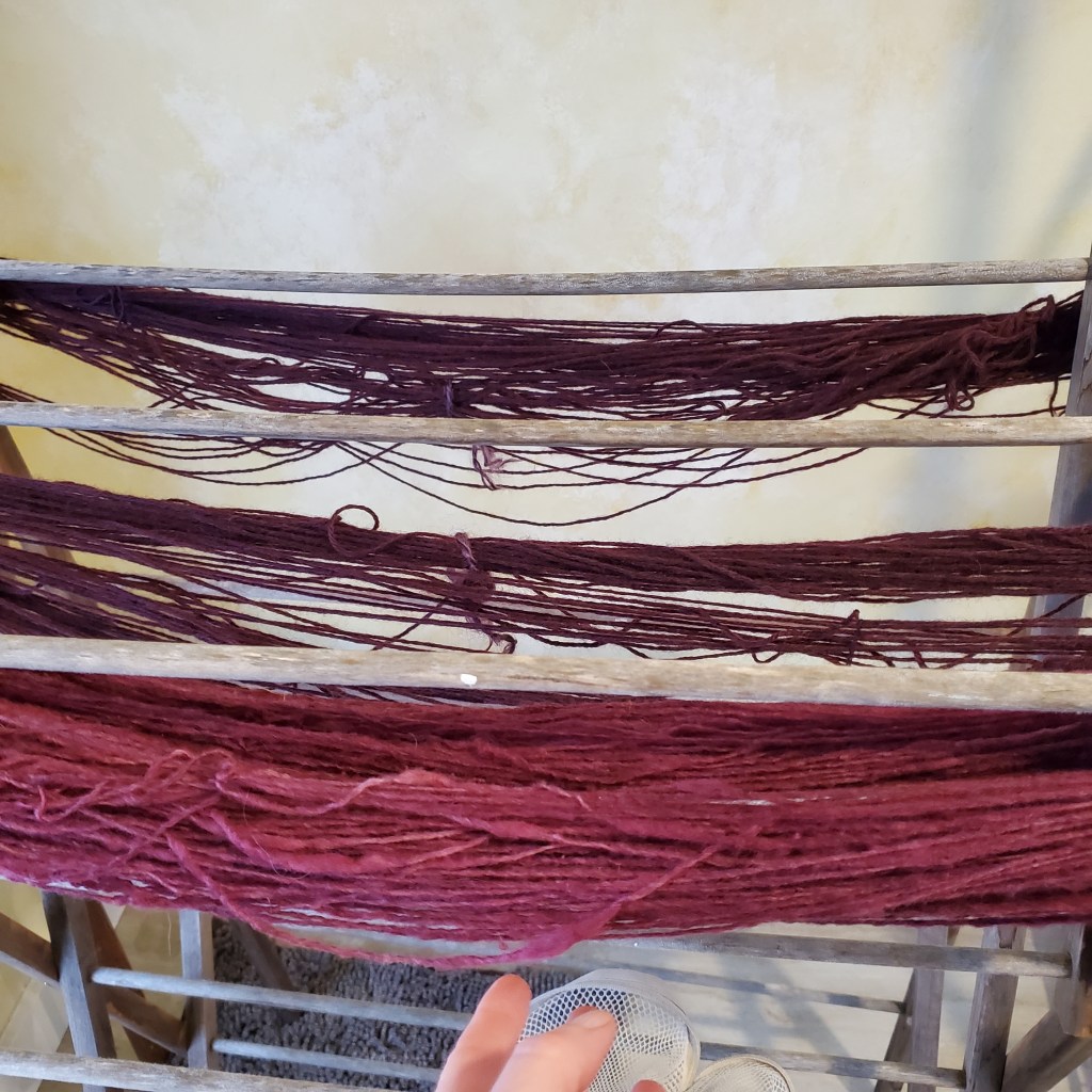 Dyed with Cushing “Burgundy.” The stuff in the back is Knit Pix originally a khaki color. I overguessed how much dye I needed, so the stuff in the front is some white handspun I threw in to soak it up.
