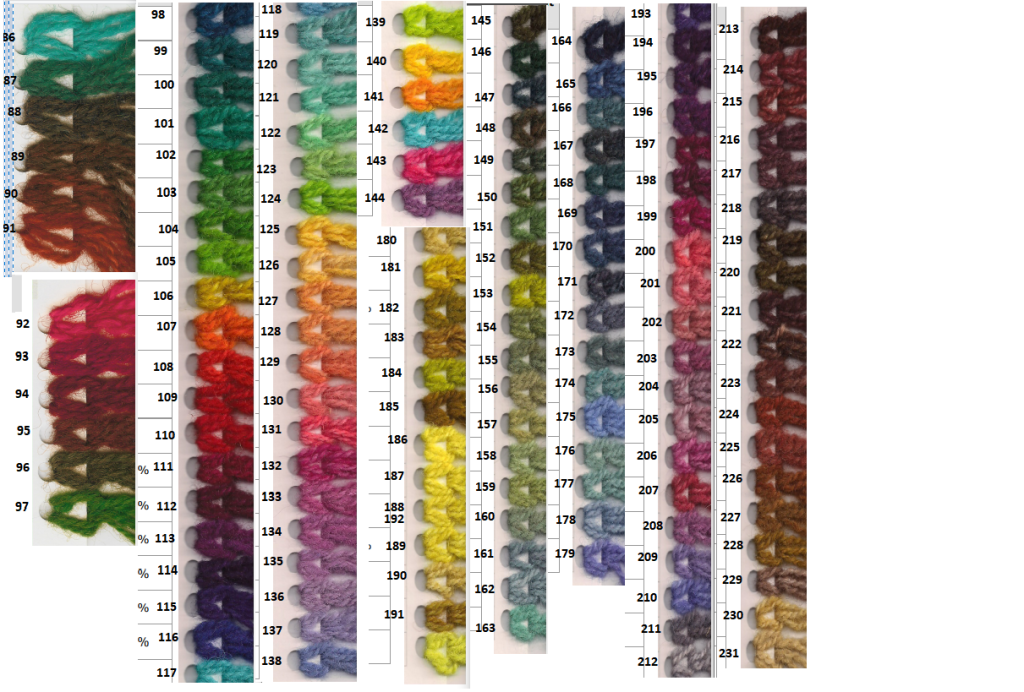 So I snipped all the colors and fit them all into two screen shots, and numbered them. Now I can see them all at once across my two screens. And, I typed all the formulas into Excel, with calculations to tell me exactly how many grams of each color to use to dye one pound of mohair! Now I can just look across my two screens, compare colors, and say, I want #142! Look it up in my spreadsheet, and say, why yes, #142 is .9 grams of Coral Reef Aqua, an excellent choice, madam.