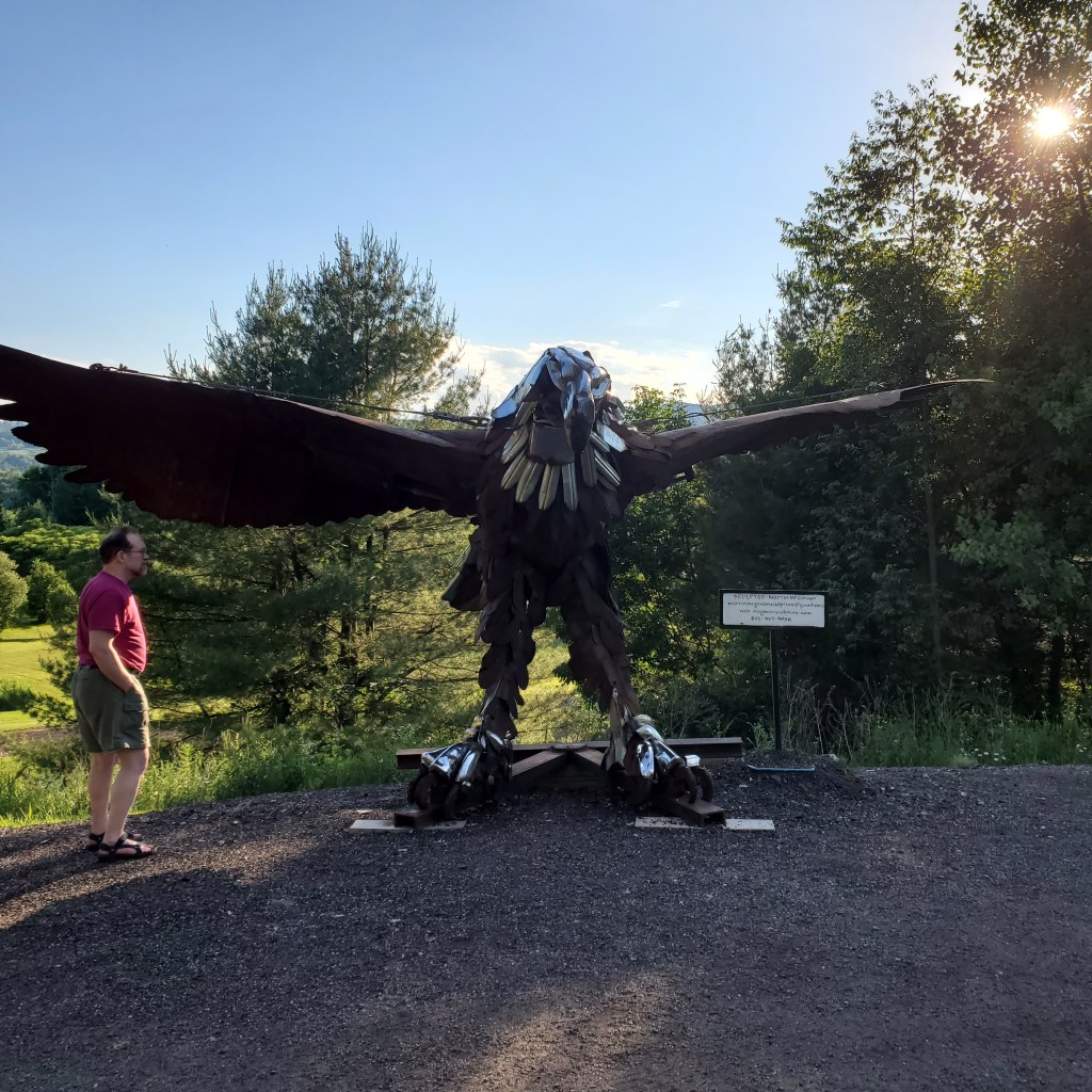 X checks out a sculpture in Waterbury Center. This on a return from our bike along the Stowe rec path. There is darn fine biking in this state.
