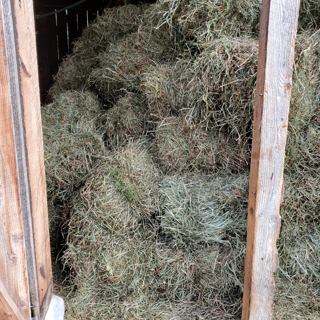 Winter hay in the barn, ready to be hoisted into the loft this weekend.