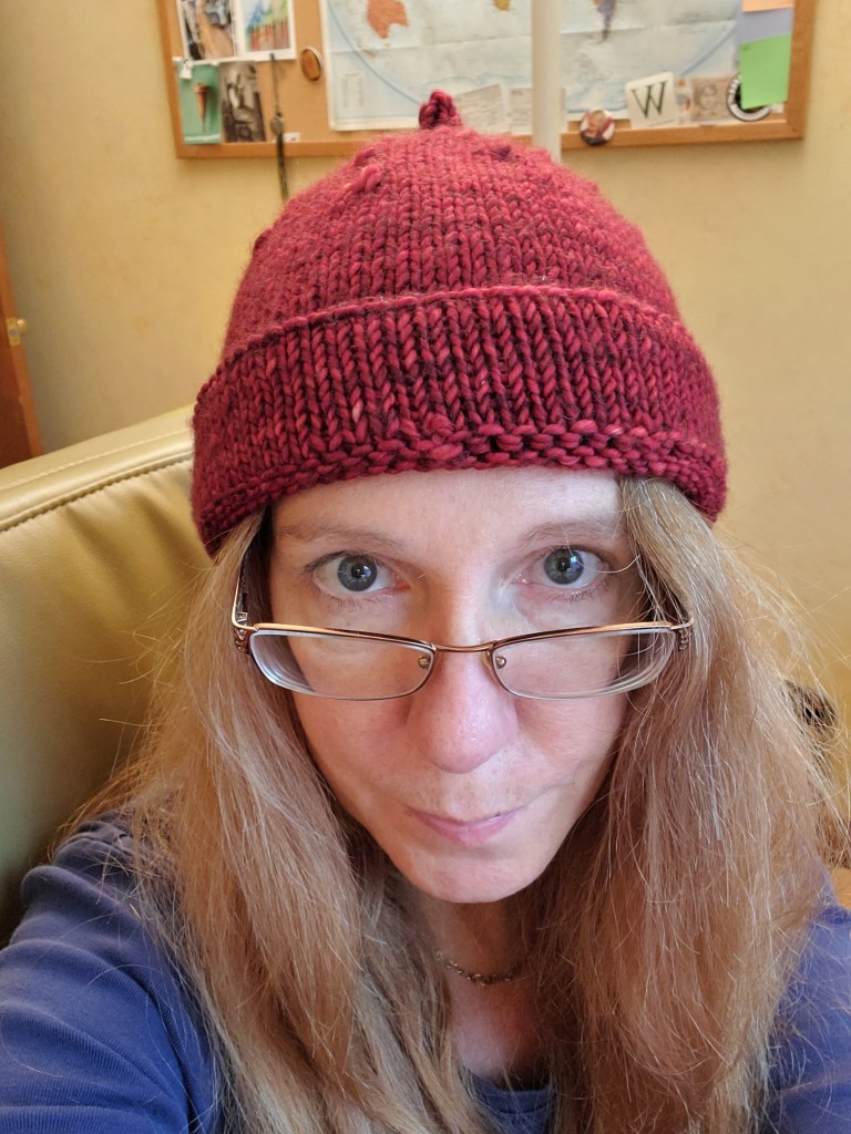 More pretty. The yarn you saw yesterday, and a hat I finished knitting the other day. It’s Malabrigo yarn, one of my favorite brands. I just wanted pretty and simple to work on during meetings.