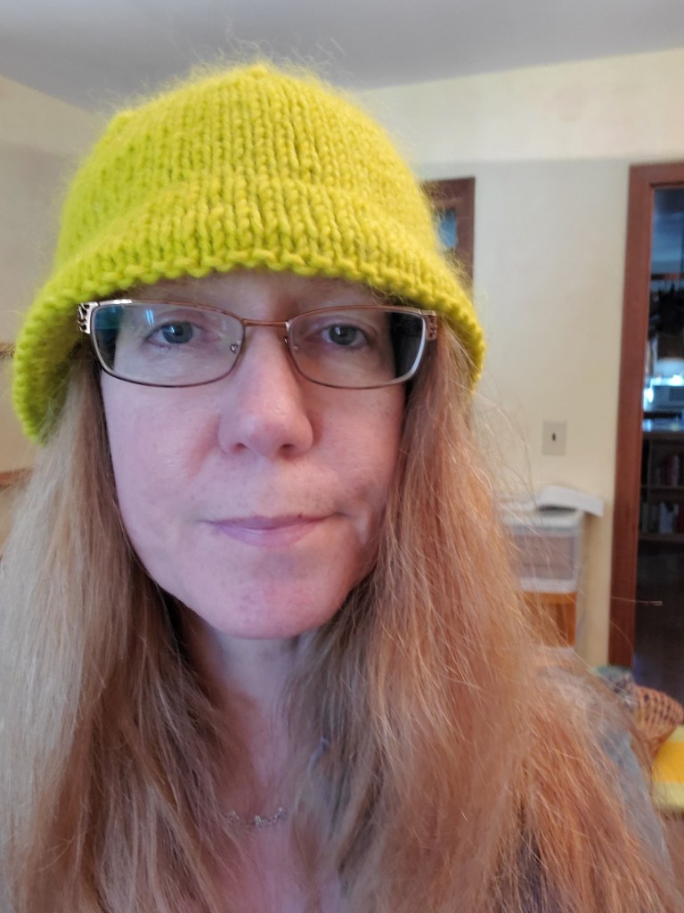 Finished knitting a hat… it’s Capricorn yarn from GMS, a bulky adult mohair-wool blend. It is not impossible that it could contain some of my goats. I bought it white and dyed it. I’m kind of a fan. I think I’ll get some more and dye some in different colors.