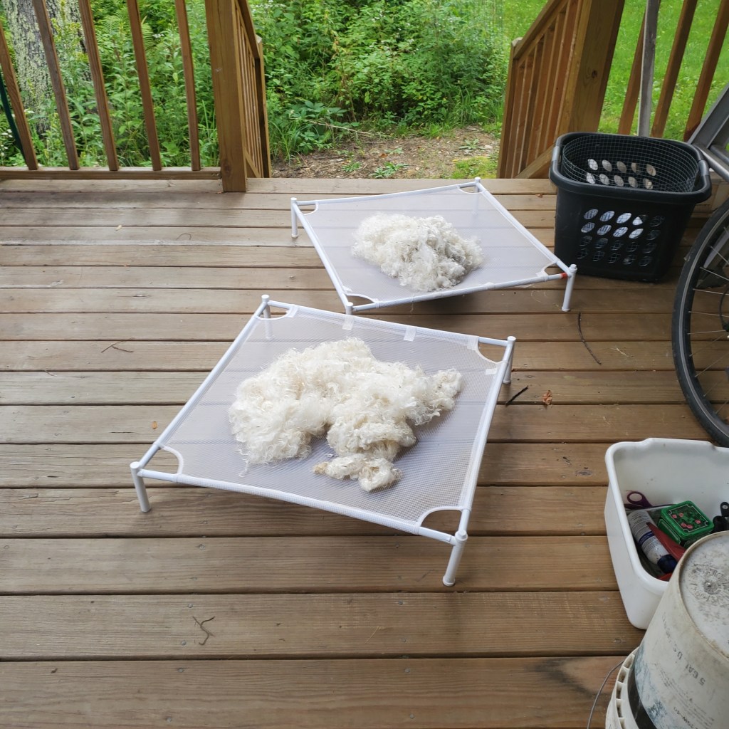 I’m really not gonna have enough mohair to fill out my 18-box display this year. I’m scraping the bottom of the barrel today with Beatrice’s fall shearing. The pictures above are from enough of a distance to make it all look so snowy-white. But the one in the foreground has a lot of dirty bits. The one in the background is almost all infested with debris. I may get one good pound of these two together.
