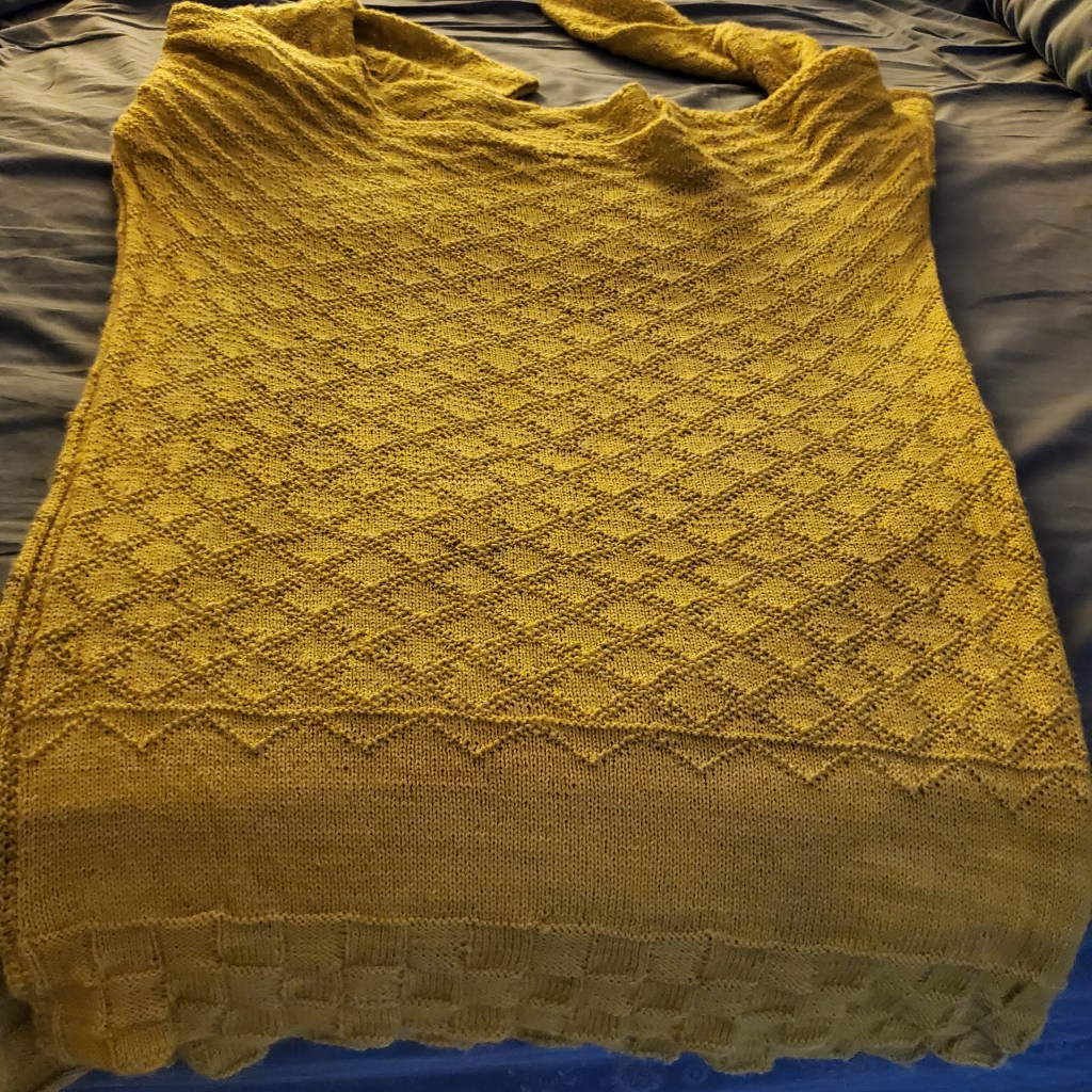 This is the last sweater I made, a couple years ago, and it’s a thing of beauty, and it’s something like 3 sizes too big for me. I just got the idea that I should felt it. Before I do so, and possibly ruin it, I wanted it documented here how lovely is the pattern.