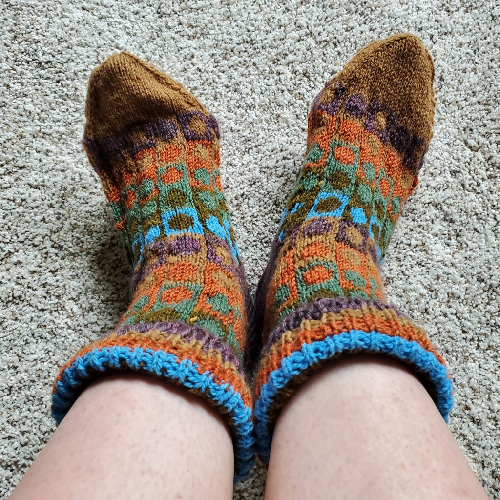 Made of yarn leftovers. Most of these colors I’d dyed myself, I think all except the orange and possibly the purple. They make a nice autumnal theme together. Now ready to pack these socks away till autumn.