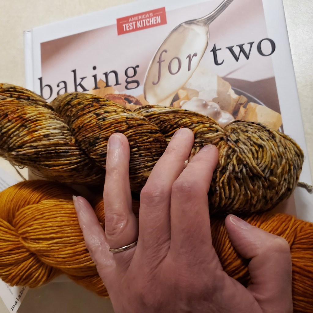 We were out & about today. I spent money gratuitously. I bought yarn because I got a hankering (get it hank) to make a yellow-ish scarf because I totally am in danger of freezing to death due to a sore lack of scarves. I bought a book of baking for two because YES I have tons of baking books and YES I have tons of books on cooking for two BUT DID I HAVE A BOOK ON BAKING FOR TWO? NO! I also bought wine.