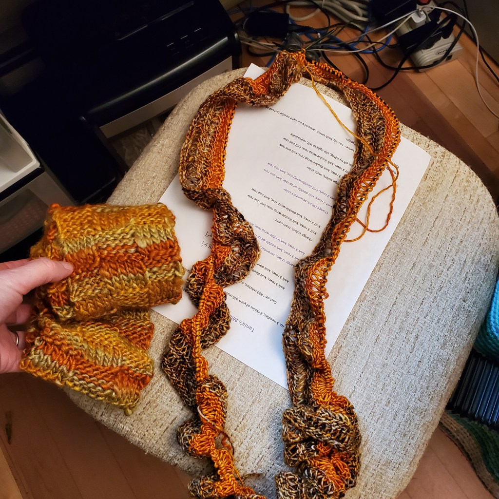 I told myself to buy this yarn because although I have 10 hand-knit scarves (and 4 hand-woven scarves and 4 boughten scarves), I didn’t have one in a yellow color scheme. Well I looked in a little-used drawer today and discovered, yes, I did already have a yellow-themes handknit scarf.