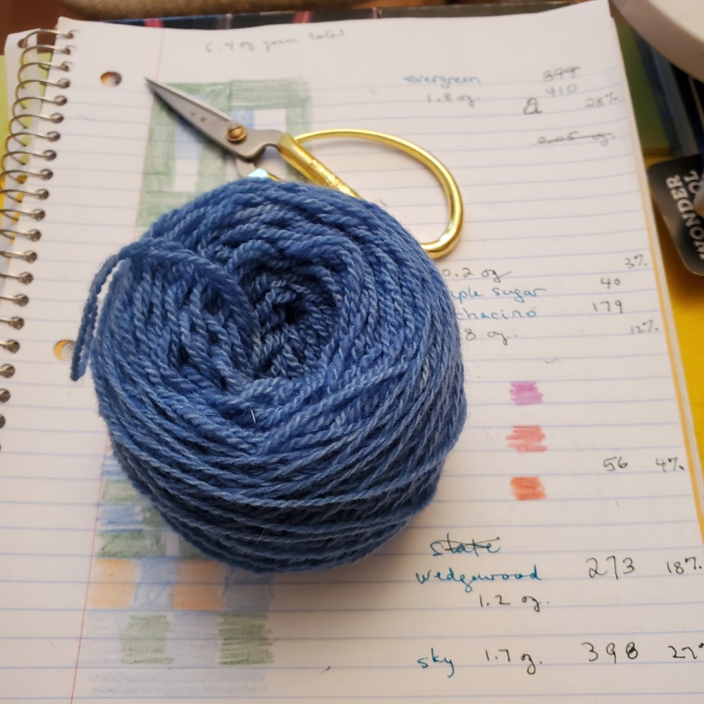I found time to dye an ounce of yarn yesterday, after we did most of the goat herd hooves before lunch. I’ve had this idea lurking of making a fair isle hat using the colors of winter – blues and browns, evergreen & white. This is ProChem Wedgewood I had lying around. Haven’t used ProChem in years.
