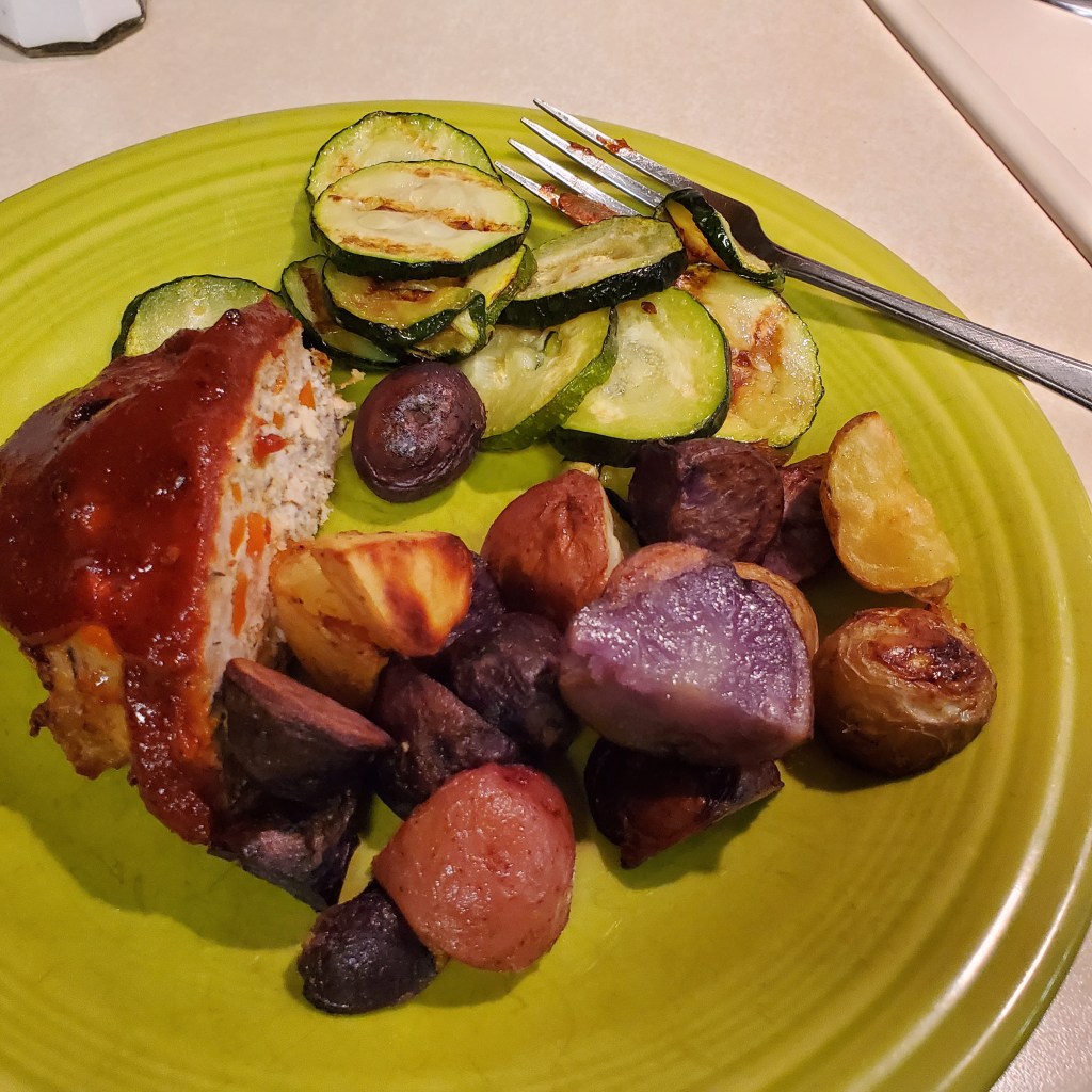 Turkey loaf from an Oprah cookbook. Farmer’s market taters. My first zucchini!