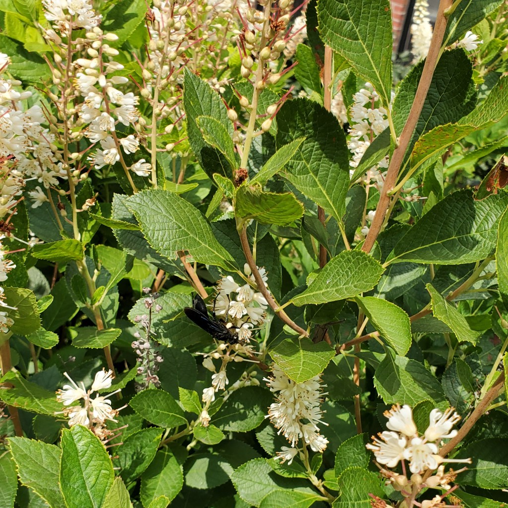 There’s a funny black wasp in this picture; shiny with some blue going on.