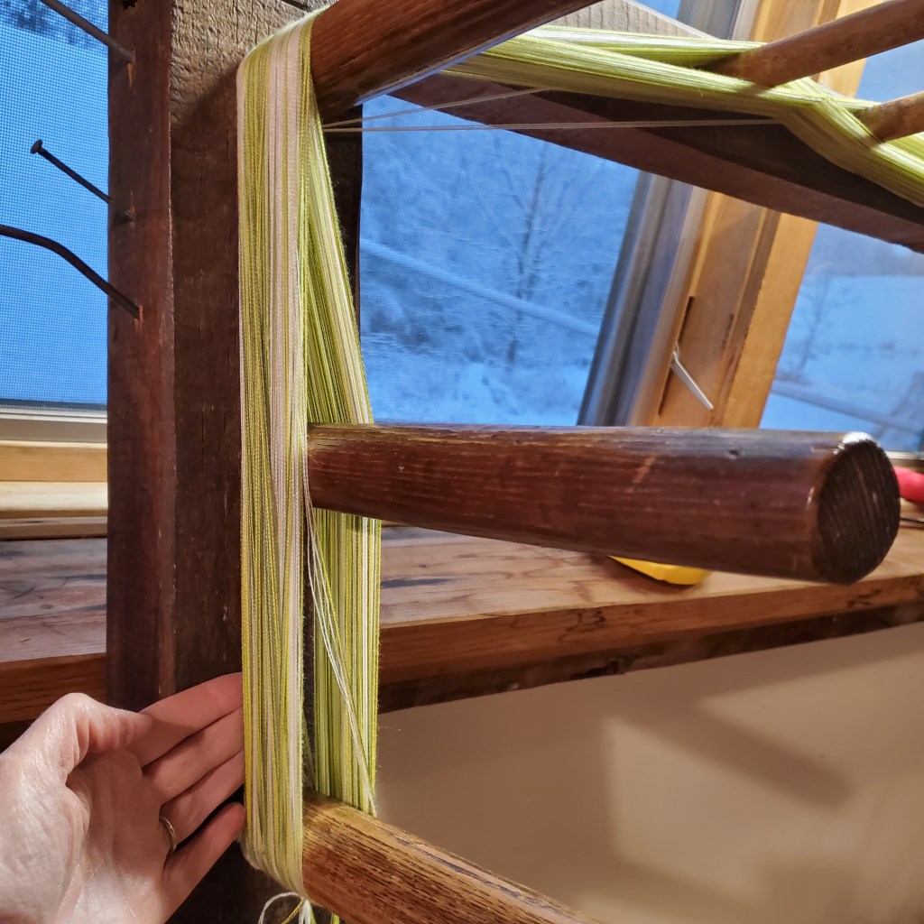 Half the warp is measured out. Was slow going getting the bobbins wound up; snaggy. Silk is beautiful and shiny but can cut you.