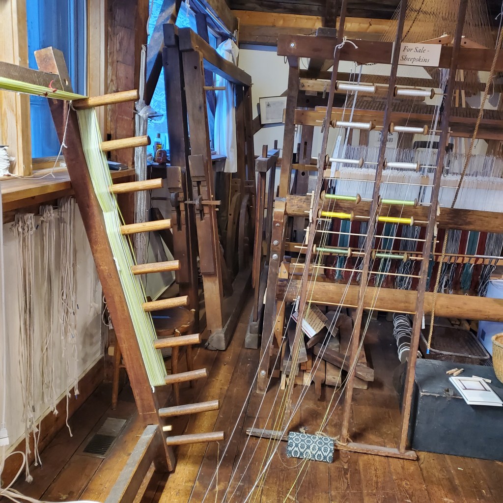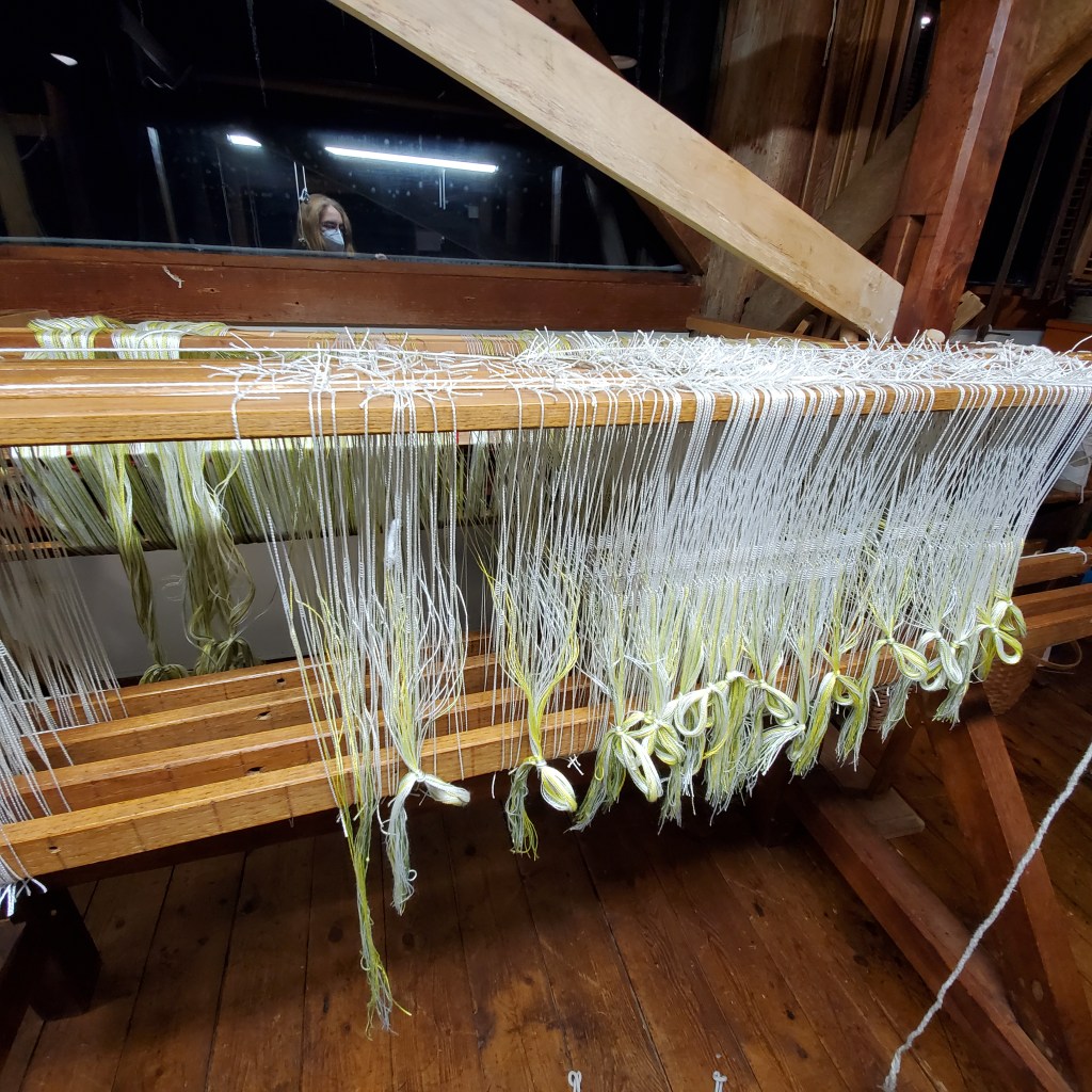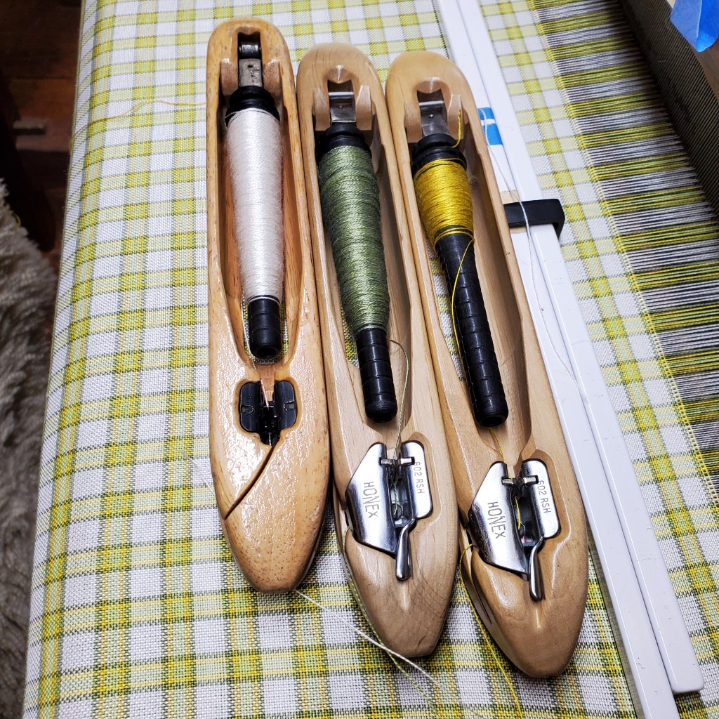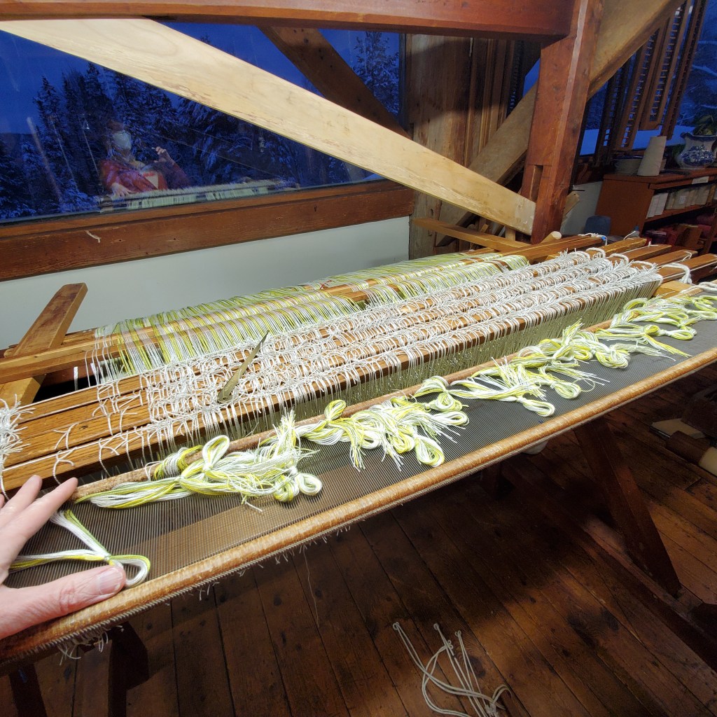 I was planning to weave twill, but I encountered a threading mistake that would have been time consuming to fix properly. We could have adjusted by adding a couple extra white threads and it would have been barely noticeable – one slightly wider white stripe in the check pattern. But I asked if the mistake actually would not even matter if I were doing plain weave, and they agreed; SO, change of plans. I’ll do it in plain weave, which is simple alternating each of the four harnesses up and down; whereas twill involves fancier treadling. I had been a little worried about adding the complication of twill on top of the challenge of properly making the check pattern. I’m always concerned about finishing on time. So it’s for the best.