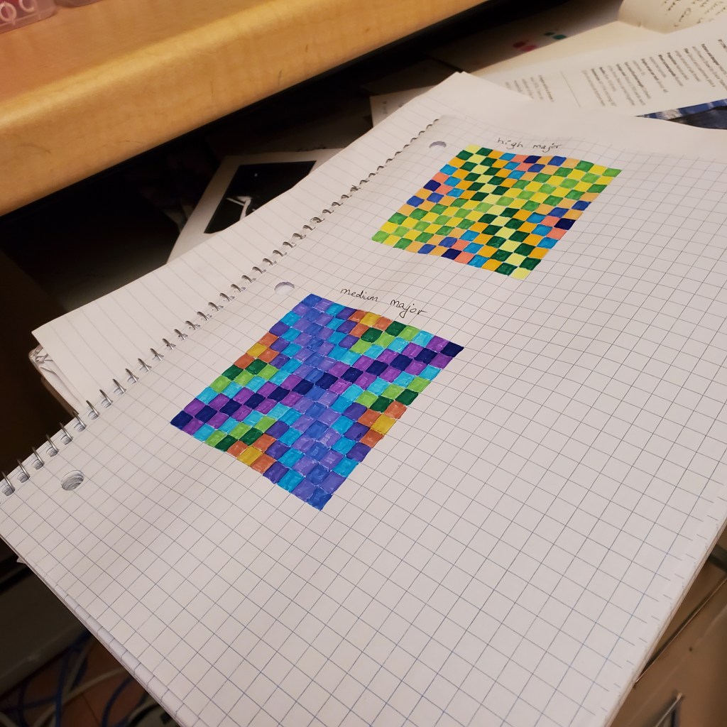 I came across another article in Spin-Off about paying attention to value more than hue. Same concepts used by Deb Menz in COLOR IN SPINNING, though I don’t know if she invented them; the top is an attempt at “high major” and the bottom is a “medium major”. Major means spanning light, medium, & dark values; and high means emphasizing light, and medium means emphasizing medium.